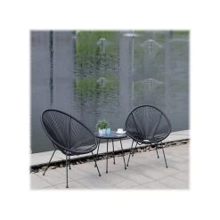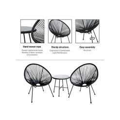 This DUKAP SASSIO modern-style patio conversation set includes two hand-woven rope chairs and one coffee table with a 5mm tempered glass tabletop. Enhance any outdoor lounging space with a minimalistic touch and superior comfort. Crafted from rattan with powder-coated steel frames, this set is weather- and water-resistant and requires minimum maintenance. It is easy to assemble and effortless to move around.