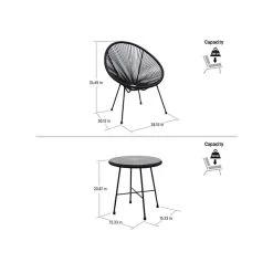 - Dimensions: 34.65″H x 28.15″W x 30.12″D (chair); 20.87″H x 15.33″Dia. (coffee table)