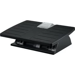 Reduce discomfort in your legs and feet with this black adjustable footrest. The black color offers a professional appearance, while the adjustable design lets you optimize this footrest for maximum comfort. This Fellowes adjustable footrest features a textured surface to prevent feet from slipping off, and it can be locked securely in place or set to allow rocking to promote leg movement as desired.