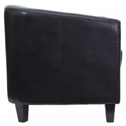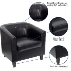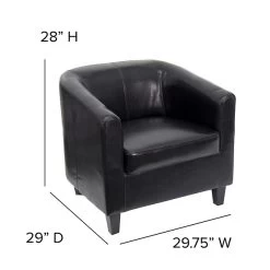 Provide comfortable, stylish seating with this lounge reception chair. The durable black LeatherSoft upholstery is made for long-term use and offers easy cleanup of dust, spills and other messes, while the padded seat provides extra comfort when sitting for extended periods of time. Designed to complement a variety of environments, this chair delivers a sophisticated appearance, making it a great option for furnishing lobbies, waiting areas and other rooms. The fixated seat cushion ensures that everything is always intact, and the solid hardwood construction stands up to daily wear and tear. This Flash Furniture guest/reception chair features sloping arms and a barrel back, offering increased support.