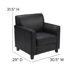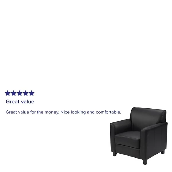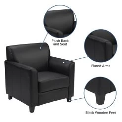 Your lobby or reception area is the forefront of your business and provides that ever important first impression. Providing distinguished and comfortable seating lets your clients know that you value their business. The modern appeal of this soft and durable LeatherSoft upholstered collection will make a lasting impression. Not only does this chair feature comfortable cushions, flared arms and raised feet, the hardwood construction frame will give you many years of use. The raised block feet look great and make it easier to clean the flooring beneath. This reception chair is perfect for the office as well as waiting room seating. The contemporary design of this furniture adapts in several different settings. This upholstered chair will not only fit in a professional environment, but will add a modern look to your home.