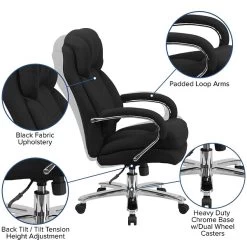 This Big & Tall Executive Office Chair is an ideal chair for larger and taller professionals who spend long hours behind a desk. An extended upper back with integrated headrest and built-in lumbar support reinforces healthy posture. The 22″ wide swivel seat is padded with 4″ of foam. Fine-tune the seat height using the pneumatic height adjustment lever. Generously padded loop arms reduce pressure on the shoulders and neck providing additional comfort. Turn the tilt tension adjustment knob to increase or decrease the amount of force needed to rock and lock the seat in place with the tilt lock mechanism. This sturdy chair has a heavy duty chrome base, smooth rolling dual wheel casters and a 500 pound weight capacity. Whether you’re buying chairs for a 911 dispatch office, call center, or control room, this 24/7 intensive use office chair is the right chair for the job.