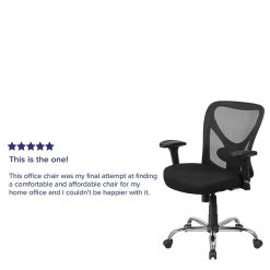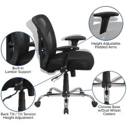 Stay comfortable during those long days at the office with a big and tall desk chair. Our mesh office chair has a tested weight capacity of up to 400 pounds to ensure a comfortable seating option for everyone. Discover the structure you need with a mid-back office chair with built-in lumbar support and an adjustable back. Enjoy a plush construction with a broad-width padded seat featuring a waterfall front edge, and a pneumatic adjustment lever underneath the seat lets you fit your chair to your preferred height. Reduce strain while working with an office desk chair that includes adjustable armrests. The supportive construction helps to reduce the pressure on your shoulders and neck, creating a more relaxed office experience. Conveniently reach anything in your office with 360 degrees of swivel motion. The base of the adjustable office chair includes five wheels for smooth rolling and a bright chrome finish.