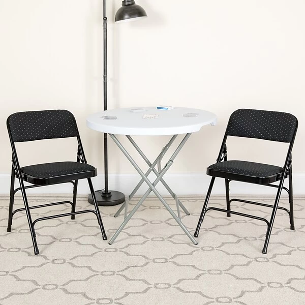 The perfect host is always prepared for that surprise guest and this Flash Furniture HERCULES Series classic upholstered folding chair is the perfect option to accommodate additional guests. These portable chairs are popular at community centers due to their durability, compact storing capability, and ease of setup. Padded folding chairs provide comfort during extended meetings and social gatherings. Their 18-gauge curved powder-coated steel frame is triple-braced and double-hinged with leg strengthening support bars to hold up to 300 lbs. Non-marring floor glides on the legs protect your floors by sliding smoothly when you move them. Built for commercial use, these attractive chairs are a smart seating solution for your next business meeting as well as in the home for family gatherings and other social events.