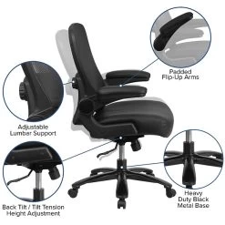 Get the extra support you need throughout your workday with our big and tall desk chair made to accommodate larger and taller body types. With a wider seat and back, this swivel chair with wheels makes it easier for long limbs to sit comfortably without restricting mobility or efficiency.This black soft and durable LeatherSoft office chair features a pneumatic adjustment lever that allows you to set the chair at your desired height. Contoured back and padded seat reduce back strain, while the office chair’s flip-up armrests relieve wrist and shoulder fatigue. For next-level comfort, the chair’s waterfall front seat is filled with five inches of thick, padded foam to provide firm support while promoting circulation. This desk chair’s heavy-duty metal base and dual-wheel casters are rated with a weight limit of 500 pounds, while its executive-style design exudes professionalism for the best of style and function.
