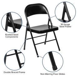 Easily switch from just the family to a 20-person marathon board game night. This durably constructed metal folding chair is a convenient option for everyday use or extra seating in a residential or commercial setting. Though it’s lightweight and easy to fold, transport, and store, it’s sturdy enough to hold up to 225 lbs.. The nonmarring floor glides on the legs protect your floors from scuffs and scrapes by sliding smoothly when you need to move the chair. Designed for indoor and outdoor use but should be stored indoors to protect from extreme moisture.