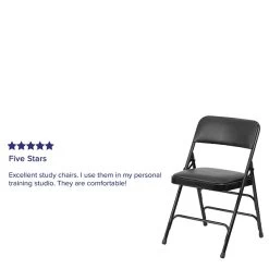 Host Thanksgiving at your house and leave out “bring your own chair” on the invite. Flash Furniture has got you covered with this two-pack of padded folding chairs. Each of these heavy-duty steel folding chairs is built for commercial businesses who host a myriad of events and need to accommodate people of varying sizes. Portable chair is perfect in community centers to transport from storage to venue floor. Change the scenery with this outdoor metal chair by taking the party outside. Take care of your chair, so it lasts you many years by storing indoors. Its 18-gauge curved steel frame is triple-braced with leg strengthening support bars to hold up to 300 lbs. while the nonmarring floor glides protect your flooring from scuffs and scrapes. Celebrate all family events at your home for guests to sit comfortably atop these upholstered folding chairs. The chairs come assembled to be of service as soon as they’re delivered.
