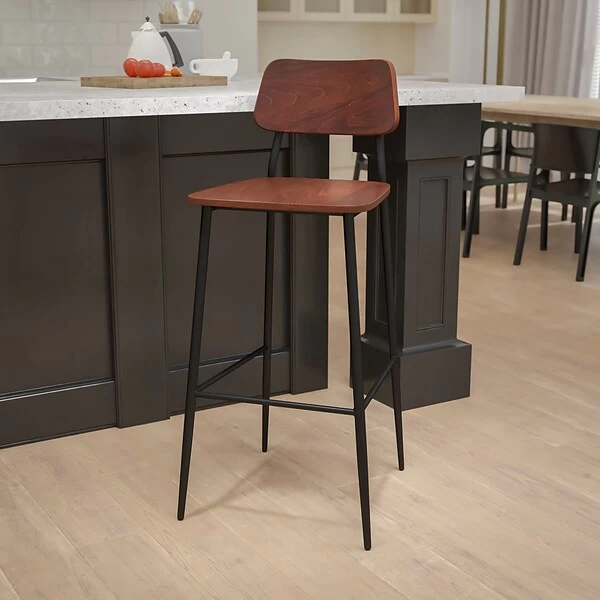 When furnishing your establishment you need seating that can change with your decor and you won’t be disappointed with this richly hued industrial bar stool. The mixed media design blends seamlessly giving this metal bar stool an up to date appearance that will go from modern industrial to rustic farmhouse. This solid restaurant dining barstool boasts an easy to clean mahogany finish that will also provide a warm and inviting quality to your home. Use this commercial grade barstool around the pub height table in your restaurant, your kitchen island or anywhere you want chic, on-trend seating. The durable steel frame is stabilized with a support bar that includes a footrest. This wooden stool arrives fully assembled for quick and easy setup. Plastic floor glides help protect your floors and ensure smooth gliding. The simple style of this rustic barstool will highlight any space in your home or business.
