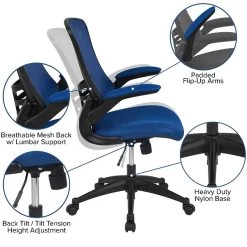 You say that you want comfort and style in your next office chair, this mesh back swivel ergonomic task office chair will exceed your needs. Beat those hot summer days with the ventilated mesh back behind you, offering up huge airflow. The curved backrest has lower lumbar support to provide you with good posture support. This well-built ergonomic office chair with flip-up arms provide relief to your shoulders and neck but is also great for users who prefer an armless design. Flip-up arms allow you to roll your chair underneath the desk without adjusting the seat height. Adjusting the seat height is easy with the pneumatic lever. Turn the tilt tension adjustment knob underneath the seat to increase or decrease the amount of force needed to rock or recline. Meeting deadlines, casual chats with colleagues and internet browsing are made easy on this contemporary swivel office chair.
