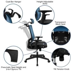 Improve productivity with a high back two-tone mesh office chair offering comfort and character to your home office or professional office. A fully transparent mesh office chair circulates air to both your back and underside. Falling articles are reduced with a coat hanger hook for convenient retrieval. Don’t be uncomfortable another workday with a synchro-tilt chair that reclines at a 2-to-1 ratio to keep your feet relatively level with the floor while reclining. The ratchet height adjustable headrest also includes a full pivot range of motion to customize to your desired positioning. The chair locks in 3 positions to lock in your reclined and working positions, adjust the rocking motion by turning the knob underneath the seat. Backed by generous lumbar support and a waterfall edge that relieves pressure from the backs of your legs, this mesh back swivel ergonomic task office chair will exceed your needs.