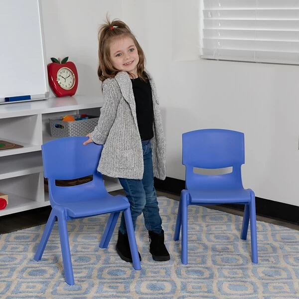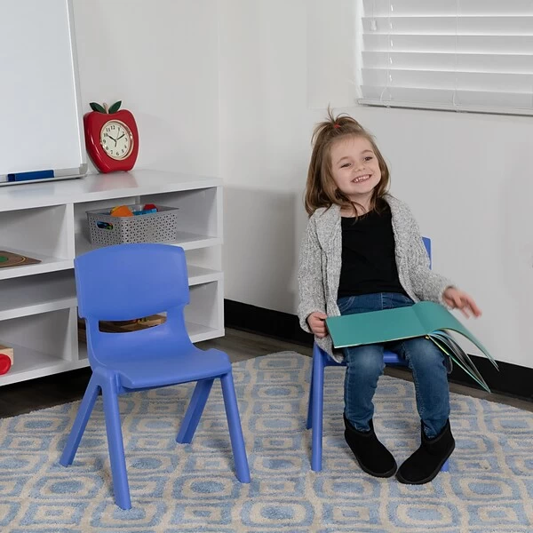 Provide safe seating for developing tots that you care for in your nursery, daycare or preschool. Well suited for the classroom, these school chairs have no metal pieces making them safe around energetic preschoolers and kindergartners. Be prepared for play dates by having additional kids chairs in the playroom, kitchen or storage area. The stackable plastic chairs are ideal for extra seating to keep around the home and stack away when no longer needed. Low in maintenance, these toddler chairs wipe clean with ease after snacks. Having young children sit in a chair that is designed for them is important in developing proper sitting habits that will last them a lifetime. Not only are these chairs designed properly, but they are lightweight so kids can feel independent by moving the chairs themselves. Complete by pairing with our plastic height adjustable activity table.