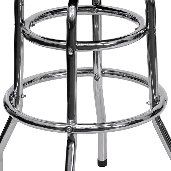 Treat the patrons of your bar, restaurant or pool hall to this superbly designed double ring barstool. The round swivel seat provides easy access and promotes conversation between customers. This commercial grade stool was built to withstand the daily rigors in the hospitality industry, but is still stylish enough for home use. The tubular footrest not only supports your feet, but acts as an additional reinforcement that helps secure the legs. This stool is also easy to clean, upholstered in a durable red vinyl cover. Add this comfortable bar height stool to your kitchen island, pub style dining table or home bar for family and friends to enjoy.