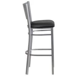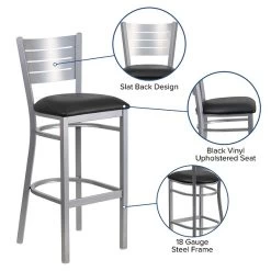 The silver slat back metal restaurant barstool will be an attractive addition to your eatery, pool hall or your bar at home. This metal barstool has a slat back design, black vinyl upholstered seat and an 18 gauge steel frame. The welded joint assembly and two curved support bars give the stool great strength and stability. The lower support bar doubles as footrest. Plastic floor glides protect your floors by sliding smoothly when you need to move the stool. The slat back metal restaurant barstool is a durable, commercial grade, restaurant barstool that also would be a great choice for use in your home.