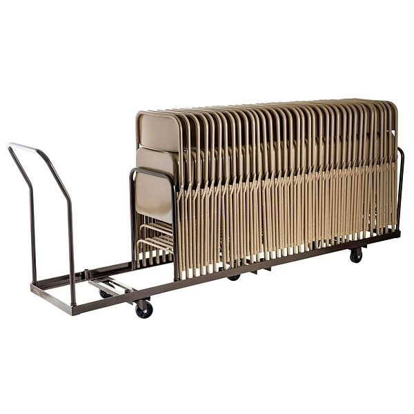 The DY-50 Chair Dolly stores and transports 50 NPS folding chairs in the vertical upright position. Features three institutional-grade tubular handles and five nylon casters (two that swivel) to enable easy maneuvering of a fully-loaded dolly. Each caster boasts a 275 lb. weight capacity for a total of 1375 lbs. Solid steel construction has a brown powder-coated paint finish.