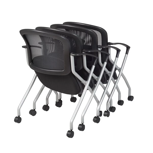Cadence nesting chairs can take you anywhere. A breathable mesh back conforms to users’ needs and the seat flips up to provide a unique nesting option. The stylish silver base features four casters for easy mobility and the seat is upholstered with a lasting black fabric. The Cadence looks great in sets and is perfect for large training rooms, labs, classrooms, cafes or waiting rooms. All Regency chairs are backed by a 5-year limited manufacturer’s warranty on chair bases and frames and a 2-year limited manufacturer’s warranty on chair mechanisms and upholstery.