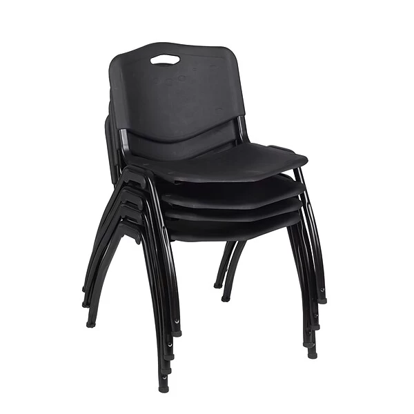 The “M” stack chair by Regency offers durability, style and value. This sturdy, lightweight stack chair is ideal for cafeterias, lunch rooms and break rooms and is available in Blue, Black, Burgundy and gray finishes. Its black metal frame and contoured plastic seat and back are strong and easy to clean. This versatile stack chair easily stores away in stacks of 12 and features a built in handle for easy mobility. The “M” ships assembled and is ready to use right out of the box. All Regency chairs are backed by a 5-year limited manufacturer’s warranty on chair bases and frames.