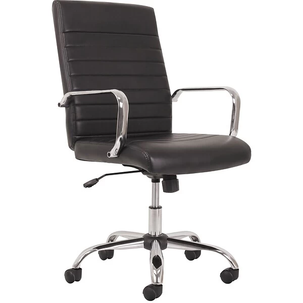 The 5-Eleven adds a sophisticated look to any work environment, from the home office to the corporate board room. The horizontal lines stitched into the Black leather padded seat and back create an upscale look and complement the Chrome frame, which looks right at home in either a mod, mid-century or a contemporary aesthetic. This chair is engineered for high-performance, with a swivel-tilt control that allows movement in any direction and a natural reclining position. Durable casters on the five-star base provide freedom of movement throughout your workspace. This chair meets or exceeds industry standards for safety and durability, and is backed by a limited 3-year warranty.