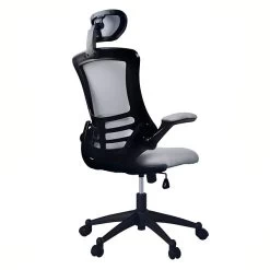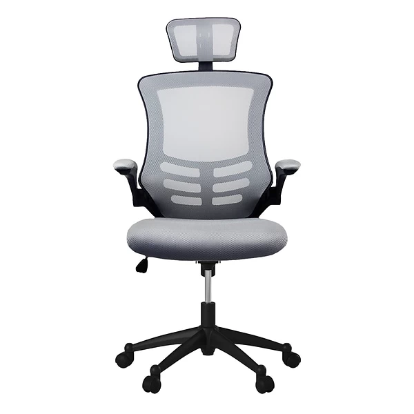 This Techni Mobili Executive Chair with head rest features a sleek, contemporary design with a breathable open mesh back support to keep you cool. It includes padded flip-up armrests, a headrest that adjusts up and down and pivots back and forth, and a seat that can be height adjusted or reclined to best suit your comfort.